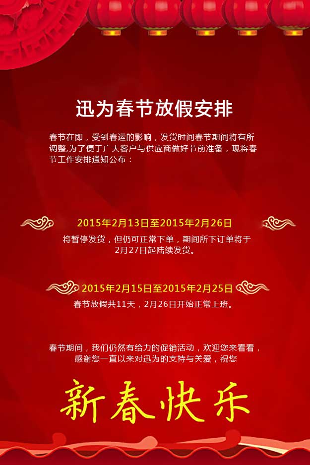 春節(jié)在即,受到春運(yùn)的影響,發(fā)貨時(shí)間春節(jié)期間將有所調(diào)整,為了便于廣大客戶與供應(yīng)商做好節(jié)前準(zhǔn)備,現(xiàn)將春節(jié)工作安排通知公布: