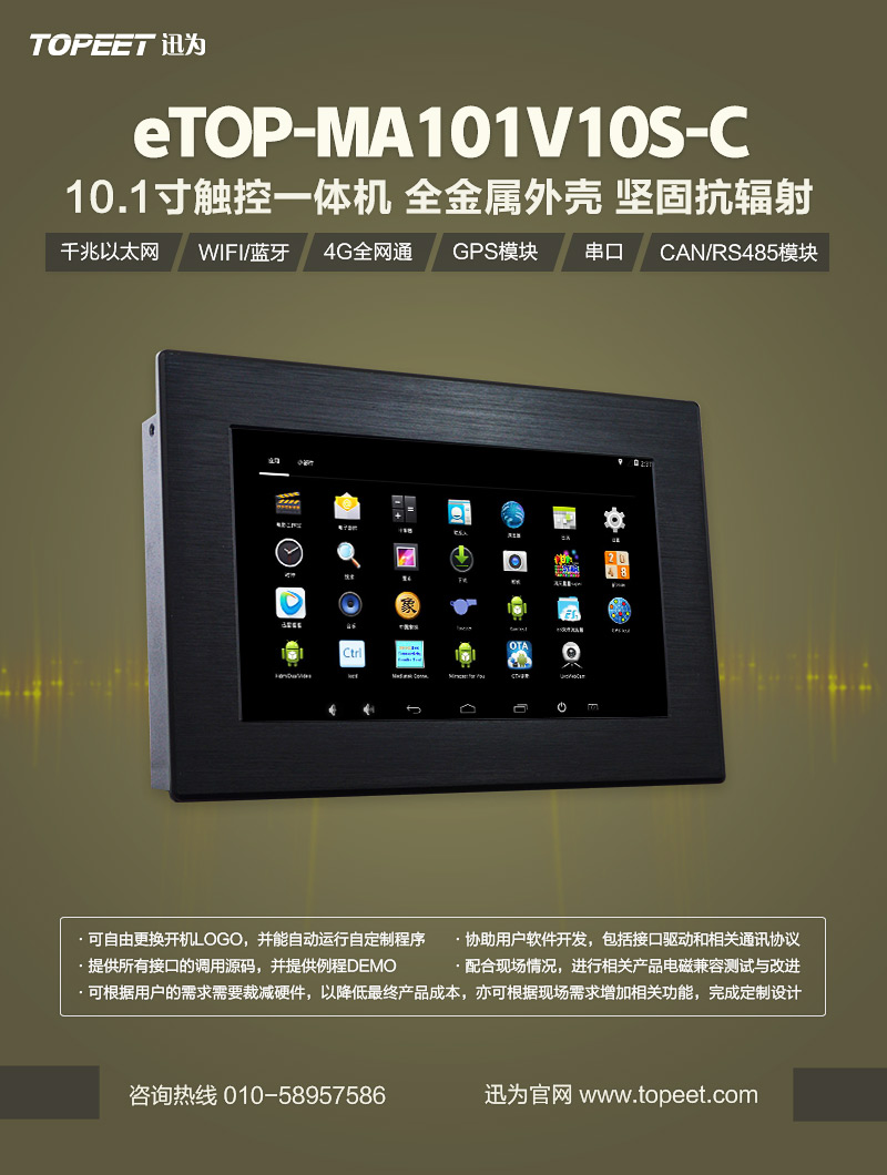 迅為電子新推出10.1寸金屬外殼工控一體機產(chǎn)品,全金屬外殼,堅固抗輻射,搭載千兆以太網(wǎng)、WIFI/藍牙、4G全網(wǎng)通、GPS模塊、串口、CAN/RS485模塊等。