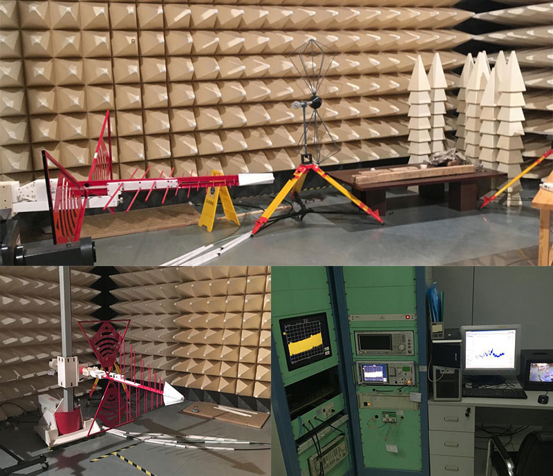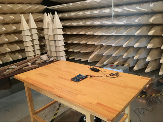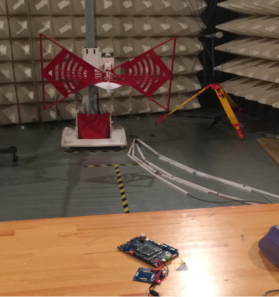 如上圖,微波暗室是采用吸波材料和金屬屏蔽體組建的特殊房間,當(dāng)電磁波入射到墻面、天棚、地面時(shí),絕大部分電磁波被吸收,而透射、反射極少。這樣我們就可以測(cè)試被測(cè)設(shè)備的輻射量是否超標(biāo)。