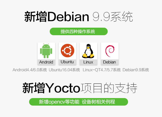 在迅為工程師不懈努力下,迅為i.MX6Q開發(fā)板不斷完善Android、Ubuntu等軟件系統(tǒng)的基礎上,新增Debian9.9系統(tǒng),開發(fā)板提升至四種操作系統(tǒng)。另外根據實際需要增加Yocto版本的系統(tǒng)支持、提供opencv以及python等技術的支持,歡迎各位新老用戶惠顧。