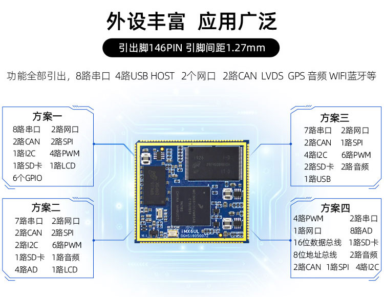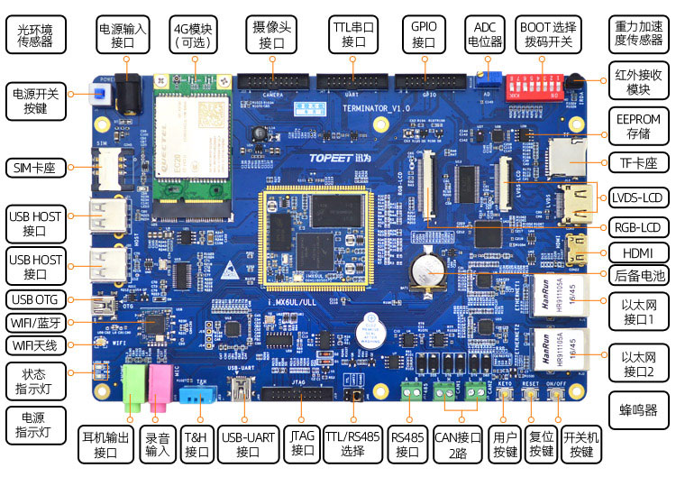 板載4G模塊、WIFI藍牙、HDMI、RGB、LVDS、以太網、溫濕度傳感器接口、USB HOST、音頻輸入/輸出、CAN總線、RS485總線等接口