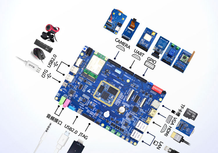 支持外接GPS、攝像頭、RFID、繼電器、LORA、步進電機、VGA、USB設備等多種模塊。
